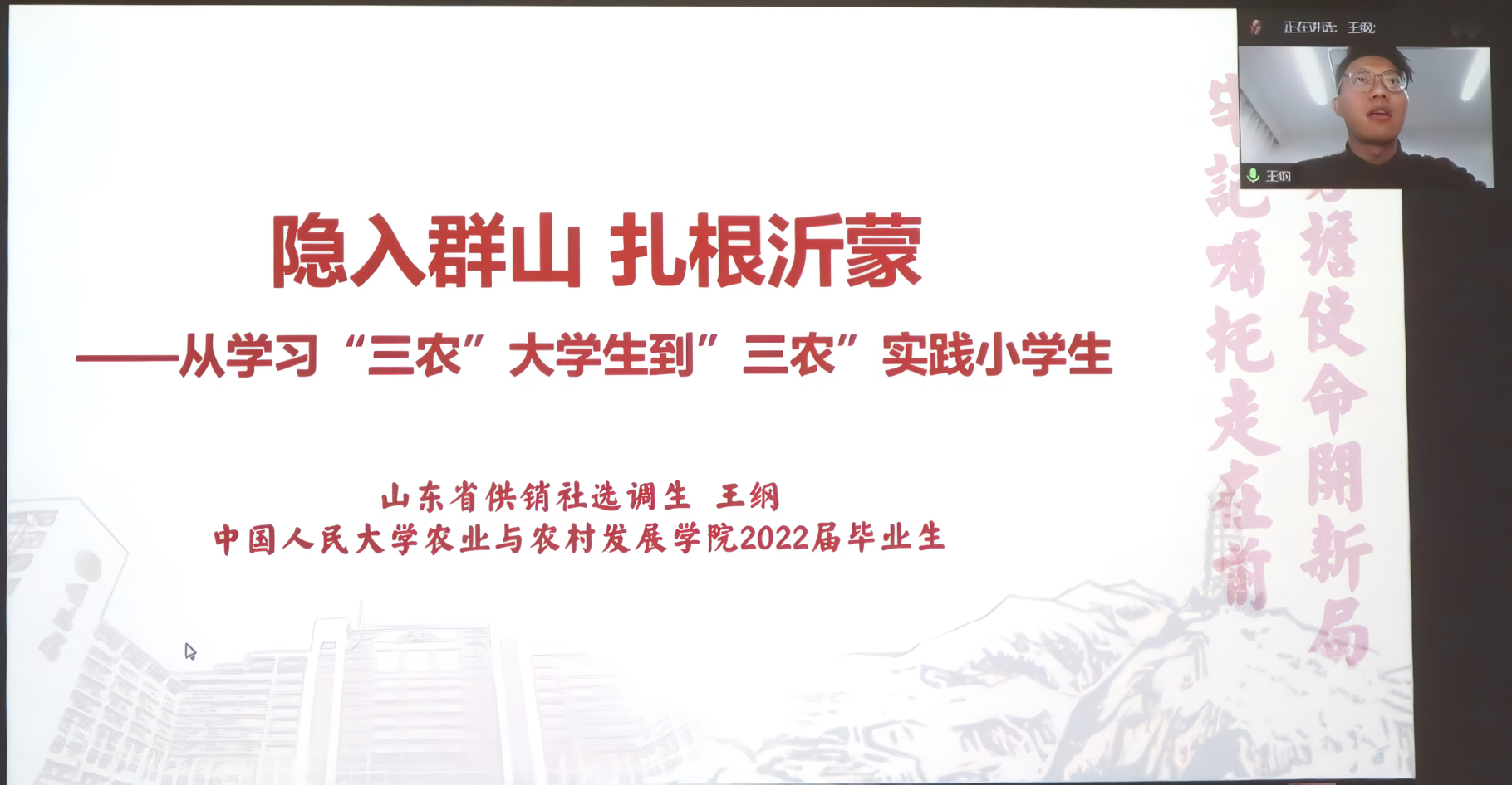 两位校友任锡廉同志和王纲同志分别是山东省发改委选调生和山东省供销社选调生,他们向大家分享了选调生的日常工作,包括会遇到的困难以及如何克服。他们表示,面对新环境与岗位,一开始总会有些许不适应,基层的工作并非想象中的简单。开展基层工作,就要联系群众,走进千家万户,了解群众的急难愁盼;要敢学敢问,以民为师,向基层工作前辈和群众学习讨教工作方式经验;要沉心静气,脚踏实地,主动迎接困难和挑战。只有亲身投入其中,排除种种困难,才能将自己的所学真正地用在为人民服务之中,真正地发扬沂蒙精神、陕公精神,将其贯彻落实在实际的工作当中。接着,他们结合自身实践经历回答了支部成员的问题,与同志们进行交流。
