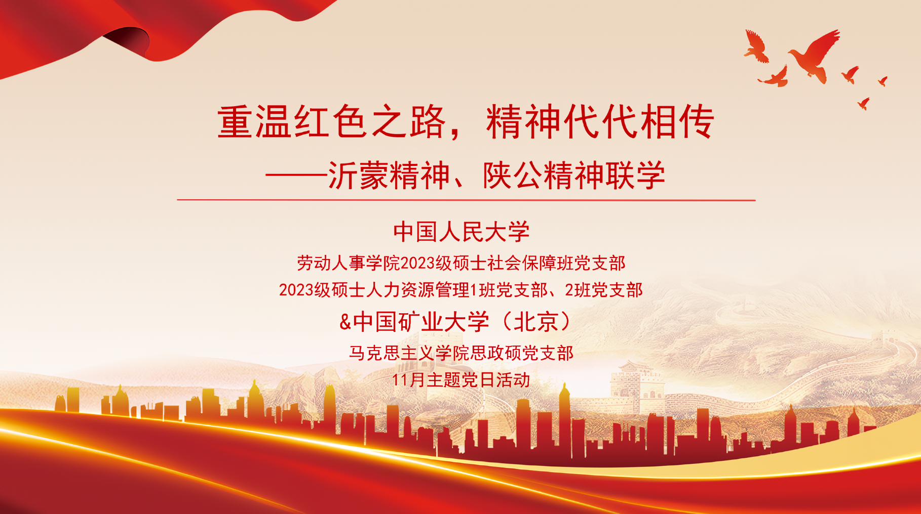2023年11月25日下午,赌博网站大全导航站 2023级硕士社会保障班、人力资源管理1班及2班党支部与中国矿业大学马克思主义学院思政硕士党支部,于公教一楼1406室联合开展“重温红色之路,精神代代相传——沂蒙精神、陕公精神联学”主题党日活动。本次活动邀请中国人民大学马克思主义学院博士生宣讲团周鼎、赌博网站大全导航站 2021级硕士毕业生任锡廉以及农业与农村发展学院2020级硕士毕业生王纲做分享,四个支部的党员同志共同参与。