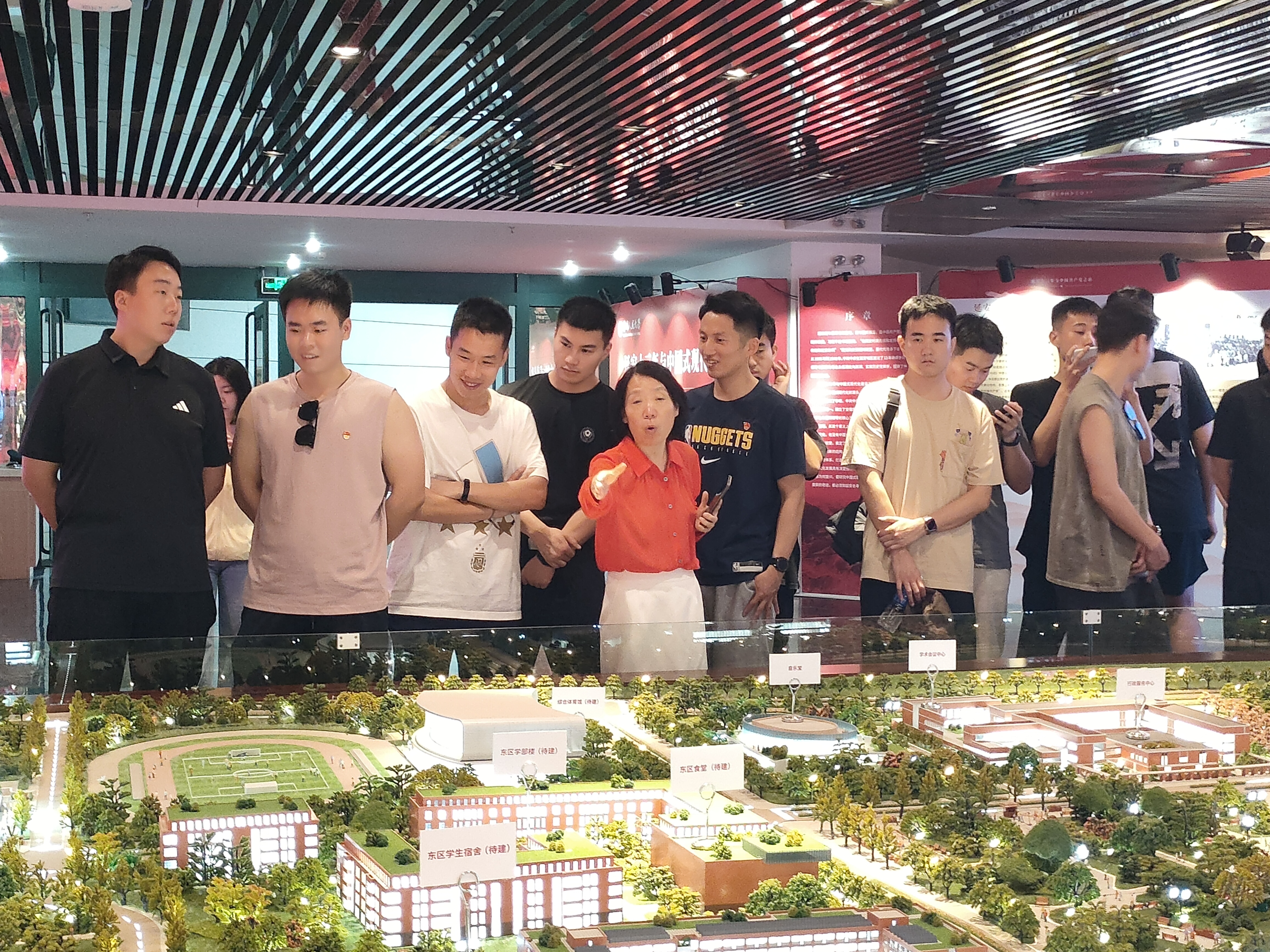 在张老师讲到毛主席所著的《矛盾论》、《实践论》等著作真迹正在展出时,参访同志纷纷驻足于前,泛黄的书页沉淀了近百年厚重的历史,激励着每一位新时代党员同志将青春写在中国大地上;面对通州新校区实景沙盘所展现的智慧高校建设成果,各位同志深切感受到京津冀协同发展国家战略的重要意义。