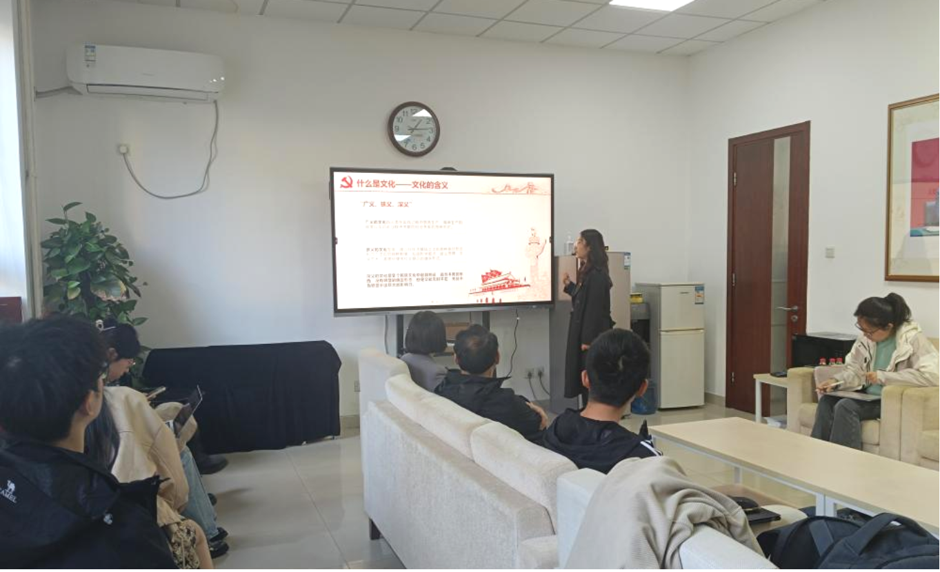 随后,2023级硕士劳动经济班党支部宣传委员李菁怡同志带领大家围绕“坚定文化自信”专题内容,学习“什么是文化”“什么是文化自信”等理论知识。两个支部的同志结合具体案例对实践中如何坚定文化自信展开了热烈讨论。