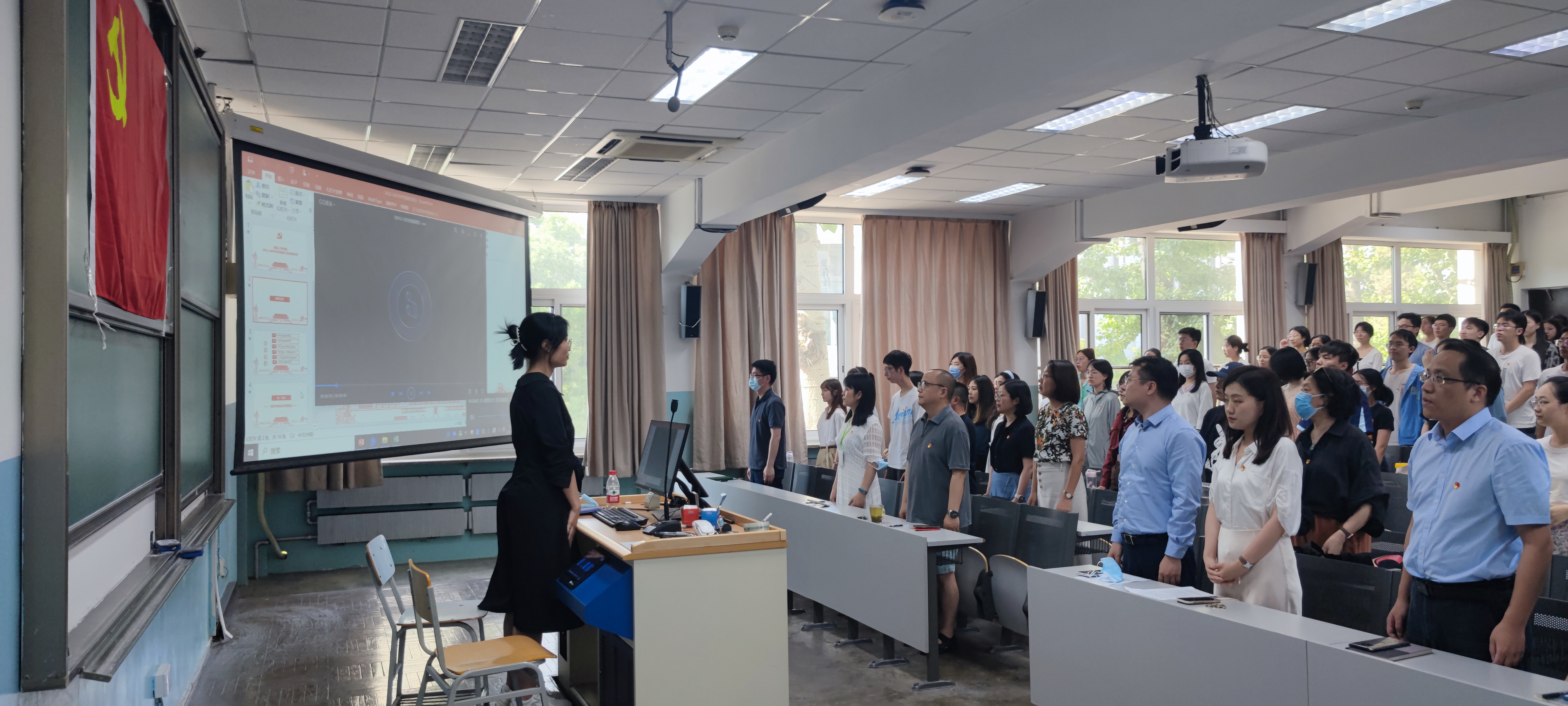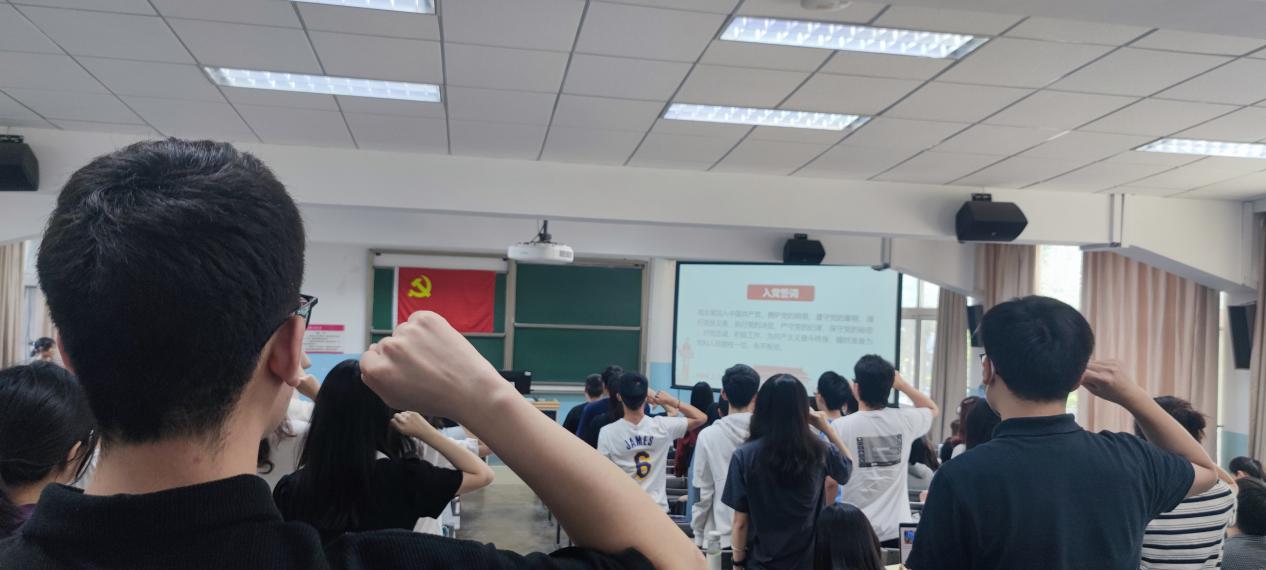 以先进典型为榜样,牢记初心使命,是预备党员走向正式党员的光荣一课。在优秀党员同志的榜样感召下,学院党务秘书王鸿飞带领本学年内新发展预备党员,集体向党旗郑重宣誓。