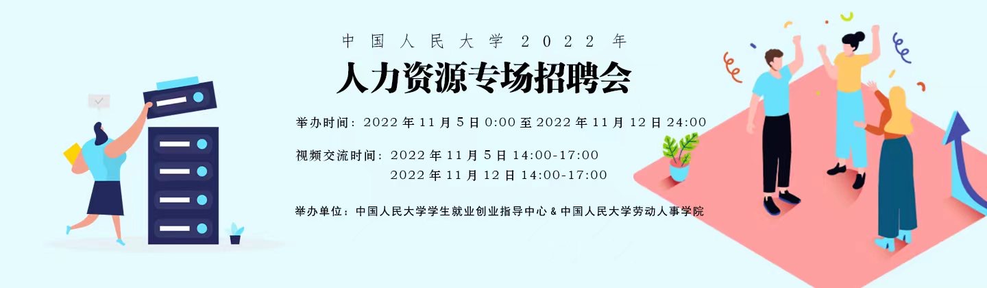 为建立我国人力资源专业供需双方的交流平台,帮助用人单位更好地获取人力资源专业人才,促进人力资源专业毕业生就业,密切与用人单位的联系合作,赌博网站大全导航站 联合学生就业创业指导中心于2022年11月5日-12日以线上方式举办“中国人民大学2022年人力资源专场招聘会”。