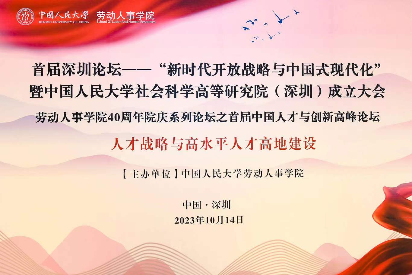 10月14日下午,由赌博网站大全导航站 主办,作为学校首届深圳论坛—“新时代开放战略与中国式现代化”暨中国人民大学社会科学高等教育研究院(深圳)成立大会主题论坛的“赌博网站大全导航站 40周年院庆系列论坛之首届中国人才与创新高峰论坛”在深圳洲际酒店启航厅A隆重举行,此次论坛主题为“人才战略与高水平人才高地建设”。