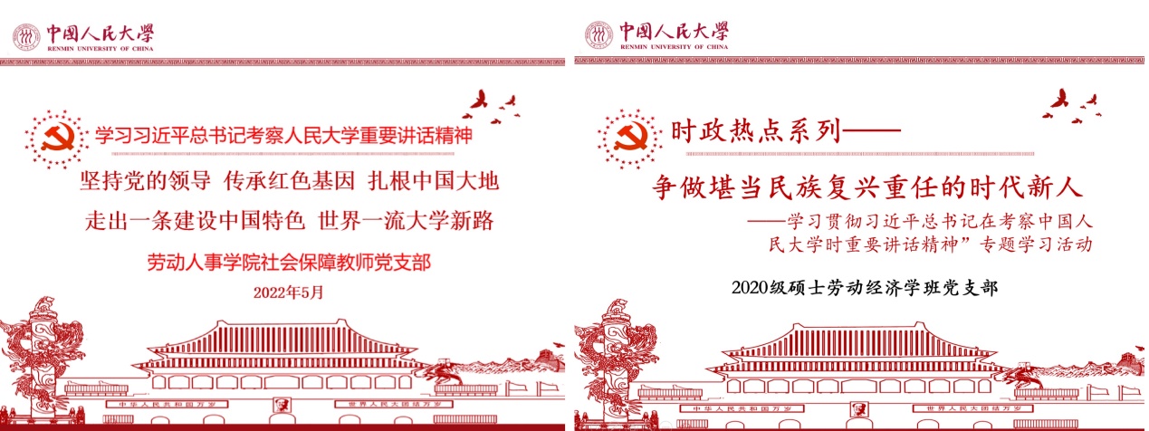 劳动经济教师党支部、社会保障教师党支部、行政教工党支部、2020级硕士人力资源管理一班党支部、2020级硕士劳动关系班党支部等开展集体学习,就新华社通稿《习近平在中国人民大学考察时强调:坚持党的领导传承红色基因扎根中国大地 走出一条建设中国特色世界一流大学新路》、教育系统学习贯彻习近平总书记在考察中国人民大学时重要讲话精神座谈会的会议精神、中国人民大学全校干部师生大会会议精神、光明日报理论文章《党办的大学让党放心 人民的大学不负人民》、中国教育报理论文章《牢记嘱托 踔厉奋发 勇毅前进》等重要文章进行研读。