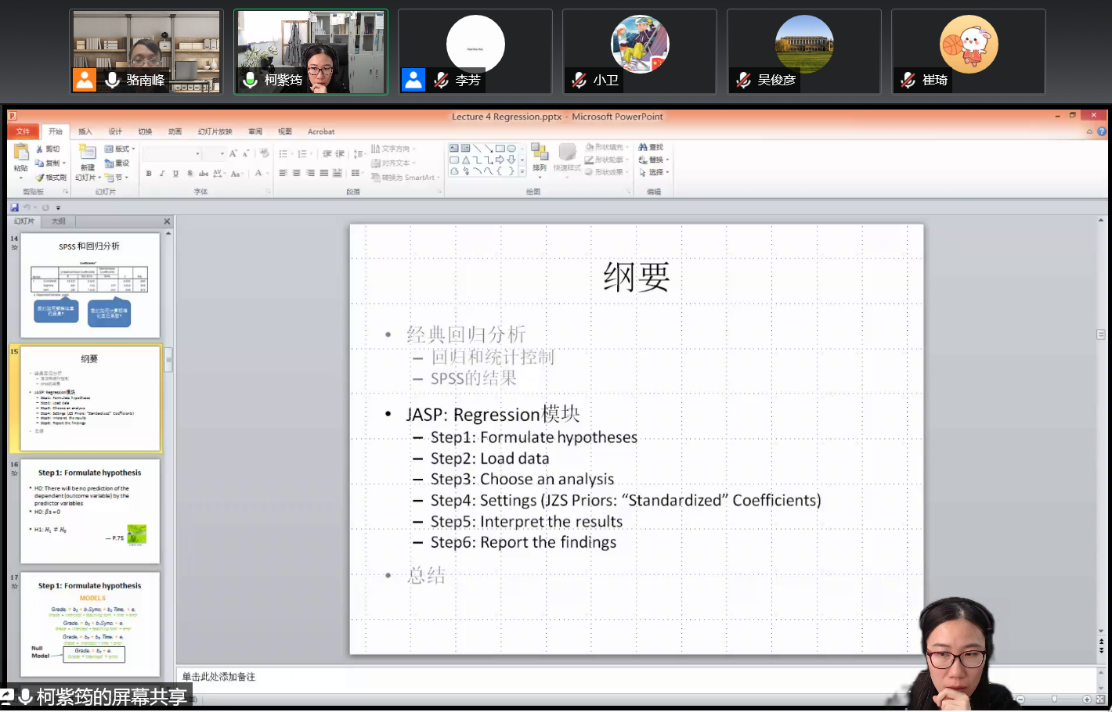 在讲座四中,柯紫筠副教授介绍了回归分析等复杂情境中利用JASP软件进行贝叶斯回归分析的具体步骤,并通过实际案例说明了如何规范地报告贝叶斯分析的结果。