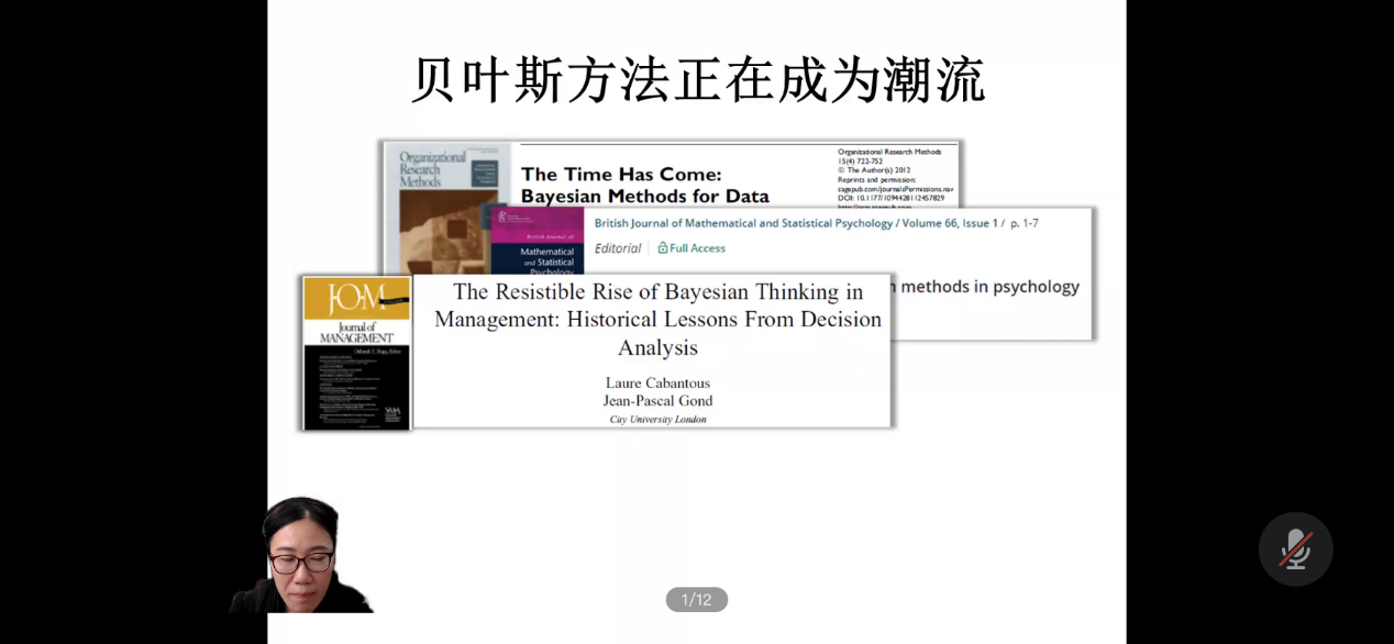 在讲座一中,柯紫筠副教授以管理学和心理学领域的顶级期刊为例,向我们展示了贝叶斯方法的应用现状与发展趋势,从方法学研究者和实际研究者两个视角介绍了贝叶斯分析方法的优势,同时,指出了贝叶斯方法可能存在的争议。
