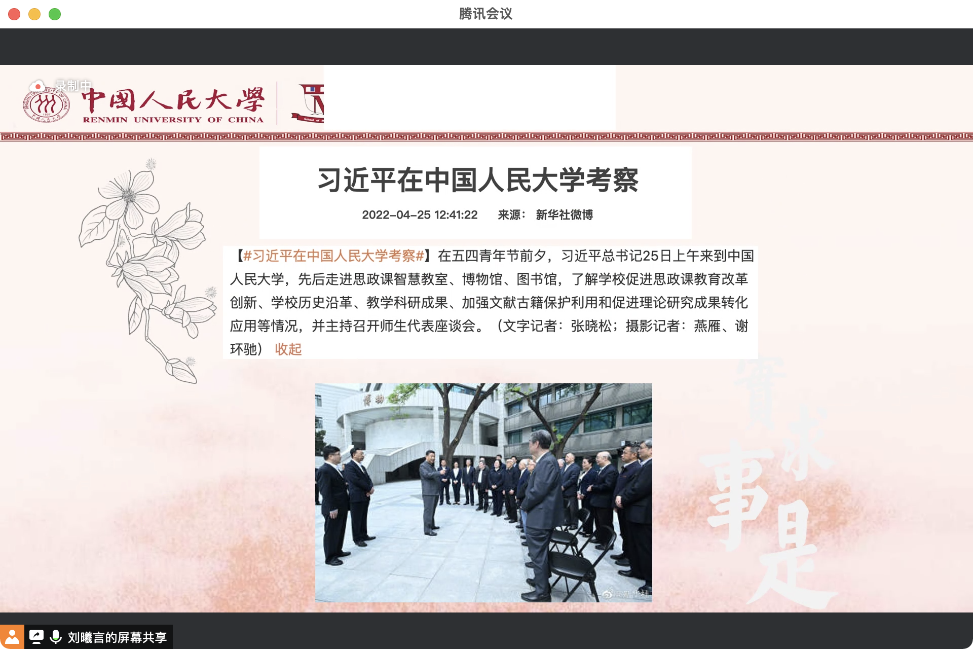 2022年5月7日晚上,2020级博士班党支部召开“学习贯彻习近平总书记在考察中国人民大学时重要讲话精神”主题党日活动。因疫情原因,本次主题党日在线上进行。支部理论学习导师、副院长周文霞参加并指导了支部活动。