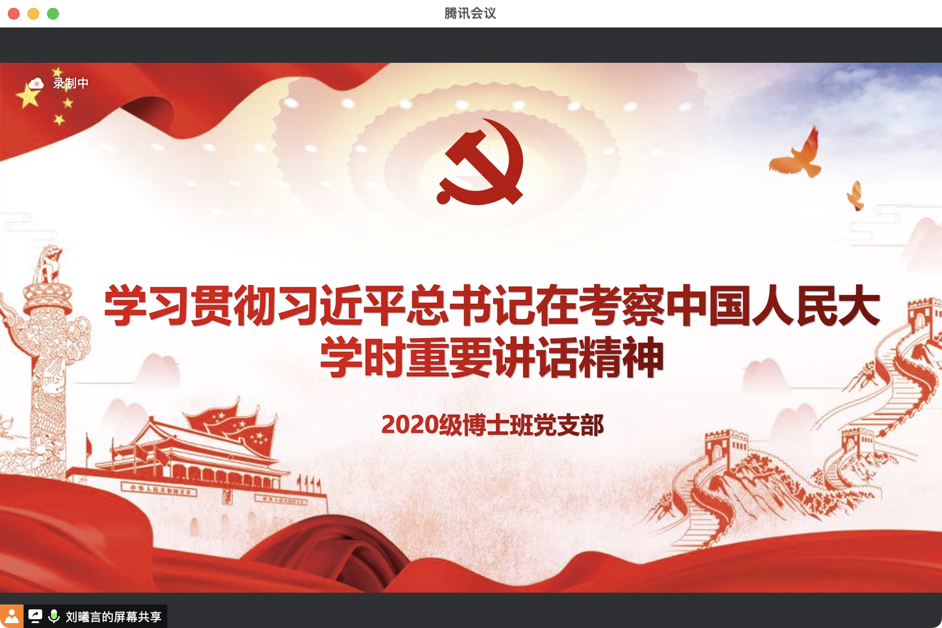 首先,2020级博士班党支部书记刘曦言同志带大家系统回顾了习近平总书记在考察中国人民大学时重要讲话精神。学习围绕四个主题展开,依次为“思政课的本质是讲道理”、“继承优良传统,赓续红色血脉”、“必须有世界一流的大师”、“打造中国特色、世界一流的学术资源信息平台”。最后,她带领支部成员重温了总书记对人大学子的殷切期望:希望全国广大青年牢记党的教诲,立志民族复兴,不负韶华,不负时代,不负人民,在青春的赛道上奋力奔跑,争取跑出当代青年的最好成绩!