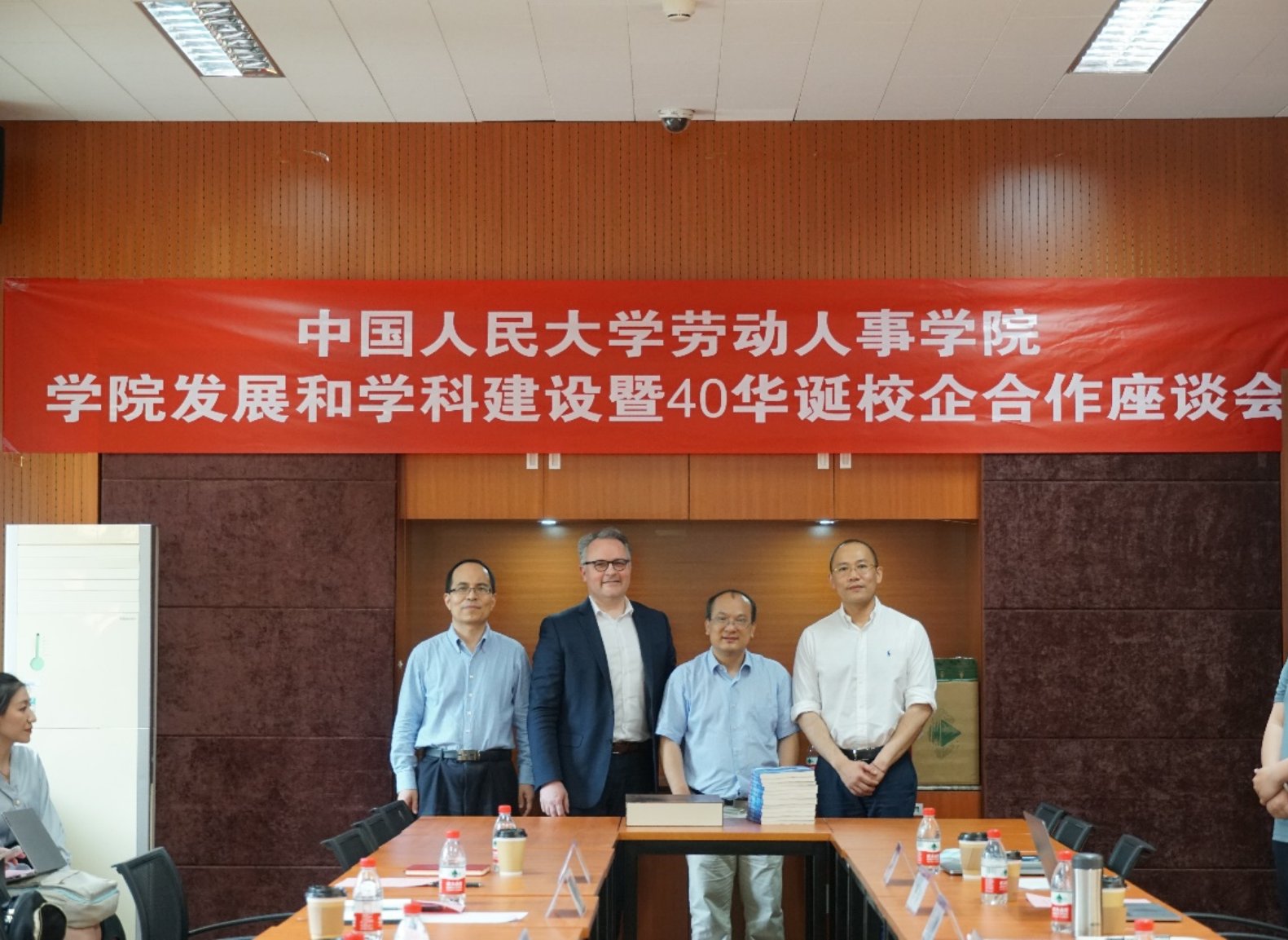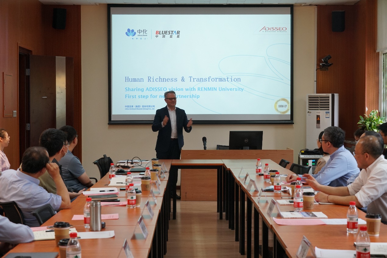 2023年5月31日下午,赌博网站大全导航站 学院发展和学科建设暨40华诞校企合作座谈会——中国蓝星(集团)股份有限公司专题学术交流会在求是楼320会议室成功举办。中国蓝星(集团)股份有限公司党委副书记、副总经理董大川,中国蓝星(集团)股份有限公司人力资源部总监、党委组织部部长王军宏,蓝星安迪苏公司副总经理(CHRO)Fabien Siguier、中国蓝星(集团)股份有限公司人力资源部高级主管仉冠乔与赌博网站大全导航站 院长、劳动经济系教授赵忠,中国人民大学人事处副处长(挂职)、赌博网站大全导航站 专业硕士学位项目中心主任、人力资源管理系教授刘松博,人力资源与领导力开发中心主任、职业开发与管理教研室教授王桢,人力资源管理系主任、副教授骆南峰,国际交流及港澳台事务项目主任、劳动经济系副教授王非,人力资源管理系讲师陈雯、李海蓉、毛凯贤,人力资源管理系师资博士后冯雯,及二十余位赌博网站大全导航站 博士研究生、硕士研究生参会。本次学术交流会由学院数据与案例研究中心主任、人力资源管理系副教授赵锴主持。