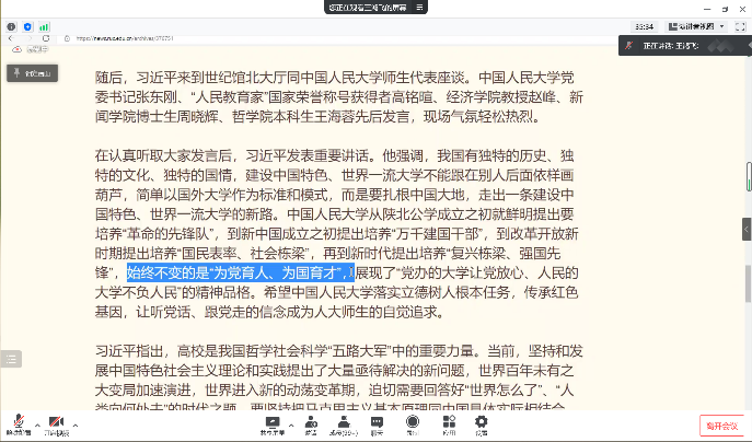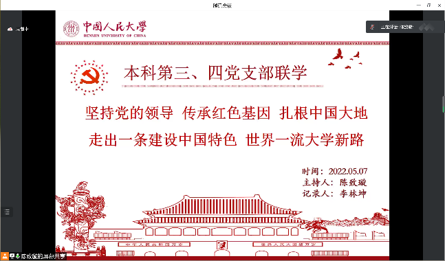 2022年5月7日,赌博网站大全导航站 本科第三、第四党支部开展专题联学活动,深入学习领悟习近平总书记在中国人民大学考察时的重要讲话精神。本次活动按照学校疫情防控相关要求采用线上方式开展,学院党务秘书王鸿飞参加活动并作宣讲,本科第三、第四党支部40余名党员和110余名积极分子参加。活动由本科第四党支部书记陈致璇主持。
