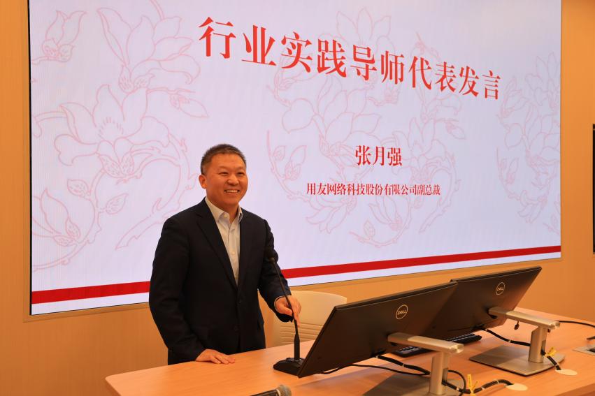 用友网络科技股份有限公司副总裁张月强,广州市人力资源和社会保障发展研究中心党委书记、主任、正高级讲师李立文作为导师代表发言。张月强结合AI时代与组织变革的背景,指出人力资源开发与管理在人机共融视角下的重要性日益凸显,并表示“教学相长”,期待与师生共同探索解决企业实际问题的方案。李立文在发言中勉励同学们要胸怀国之大者,恪守学术规范,并保持积极向上的健康心态,期待搭建学术前沿与社会实践沟通的桥梁。