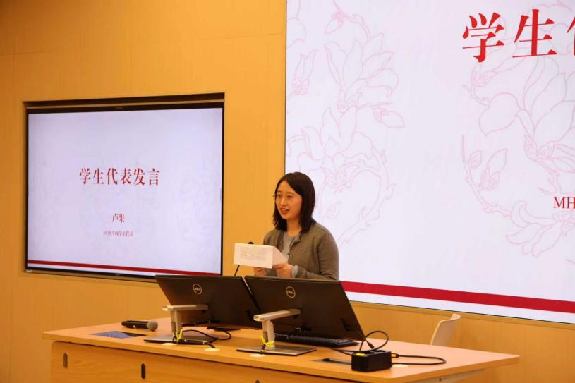 MHR专硕班学生代表卢果同学结合入学以来的学习经历,深情回顾了自身成长与收获。她以与孙军、余清泉、杨征等校外导师交流互动的真实故事为例,生动讲述了来自业界导师的悉心指导和启发帮助,建议师弟师妹们珍惜MHR项目提供的“双导师”资源优势,主动加强与导师的沟通交流,在实践中明确发展方向、完善职业规划,走好专业成长的每一步。