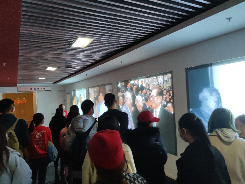 随后,讲解员向支部成员介绍了中国人民大学校徽及其内涵,三个篆体的“人”字分别代表人民、人本和人文,寓意中国人民大学是人民的大学,坚持以人为本的精神,以及在人文社会科学领域独树一帜。继续前行,走廊一边出现了历届党和国家领导人视察人民大学的珍贵影像,展现出中国人民大学在我国高等教育领域的重要地位。