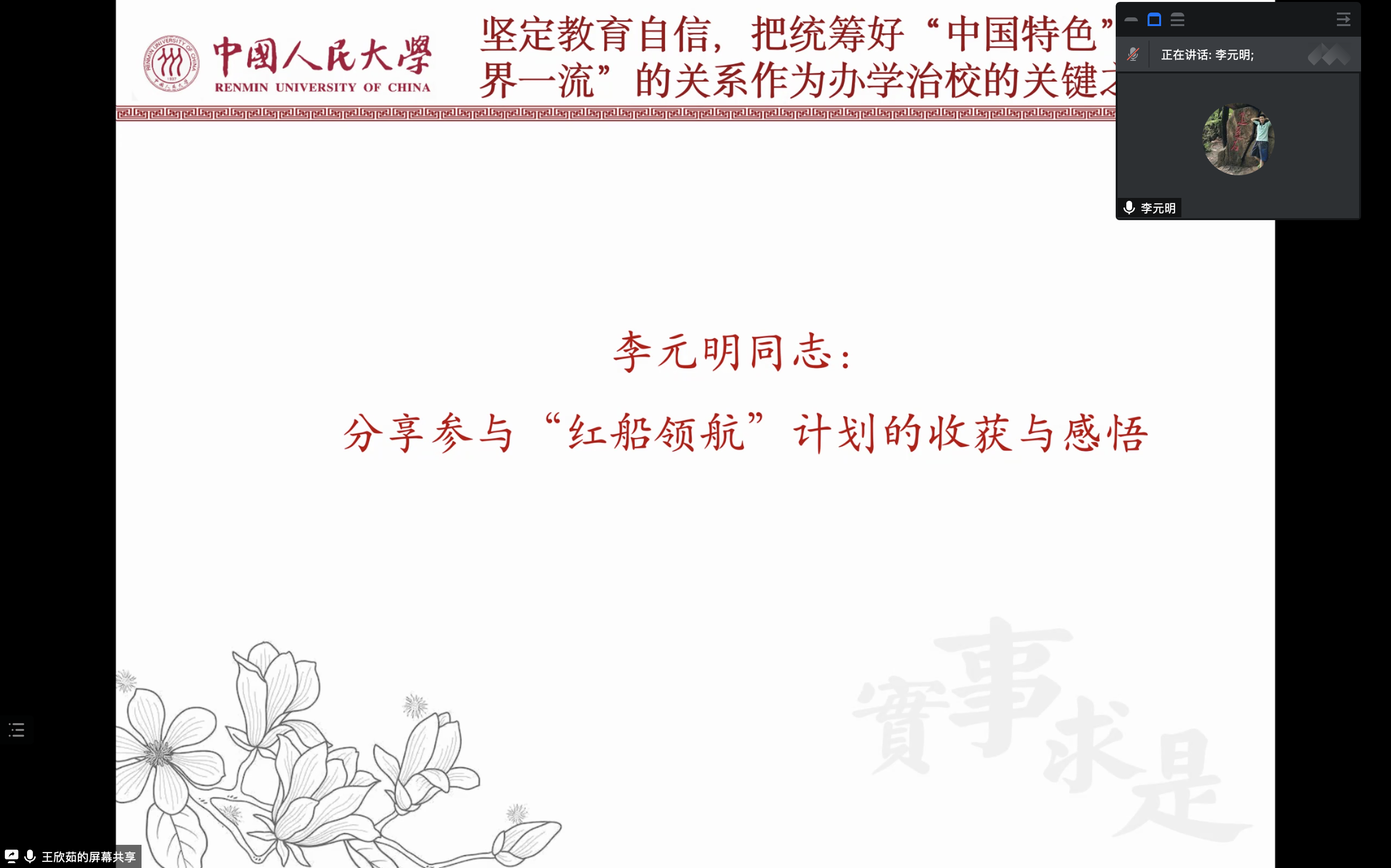 在坚定教育自信部分,王欣茹带领与会同志学习原文,生动讲解了“中国特色”与“世界一流”的关系,鼓励大家自觉坚定中国特色高等教育的道路自信、理论自信、制度自信、文化自信。作为中国人民大学学生党员教育品牌项目,“红船领航”新生党员先进性熔铸计划是学校培养环节中的特色之举,支部党员李元明分享了自身参与“红船领航”计划的收获与感悟。