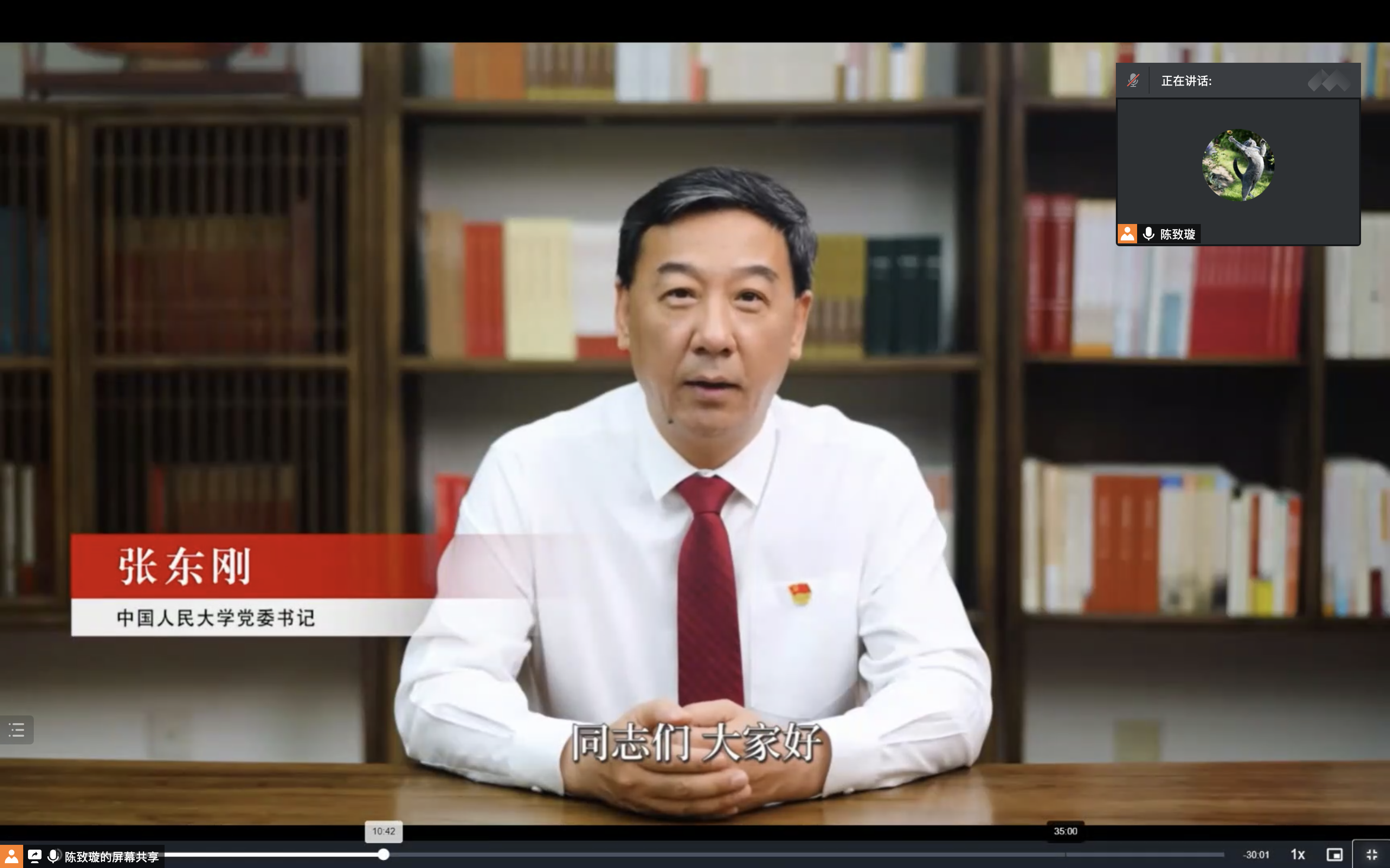在传承红色基因部分,陈致璇带领与会同志云游校史展,以线上形式参观学校博物馆。老照片和旧物件承载了校史中的红色根脉,生动呈现了中国人民大学光荣的革命传统和鲜明的红色基因。参观结束后,大家集体收看了张东刚书记主讲的示范微党课,对中国人民大学“为党育人为国育才”的初心和使命有了更深刻的理解。陈致璇鼓励大家在继承革命传统、赓续红色血脉、擦亮精神底色上要态度鲜明、行动坚决,自觉深入学习党史、新中国史、改革开放史、社会主义发展史和校史,在传承红色基因中激发使命担当,勇做“复兴栋梁、强国先锋”。