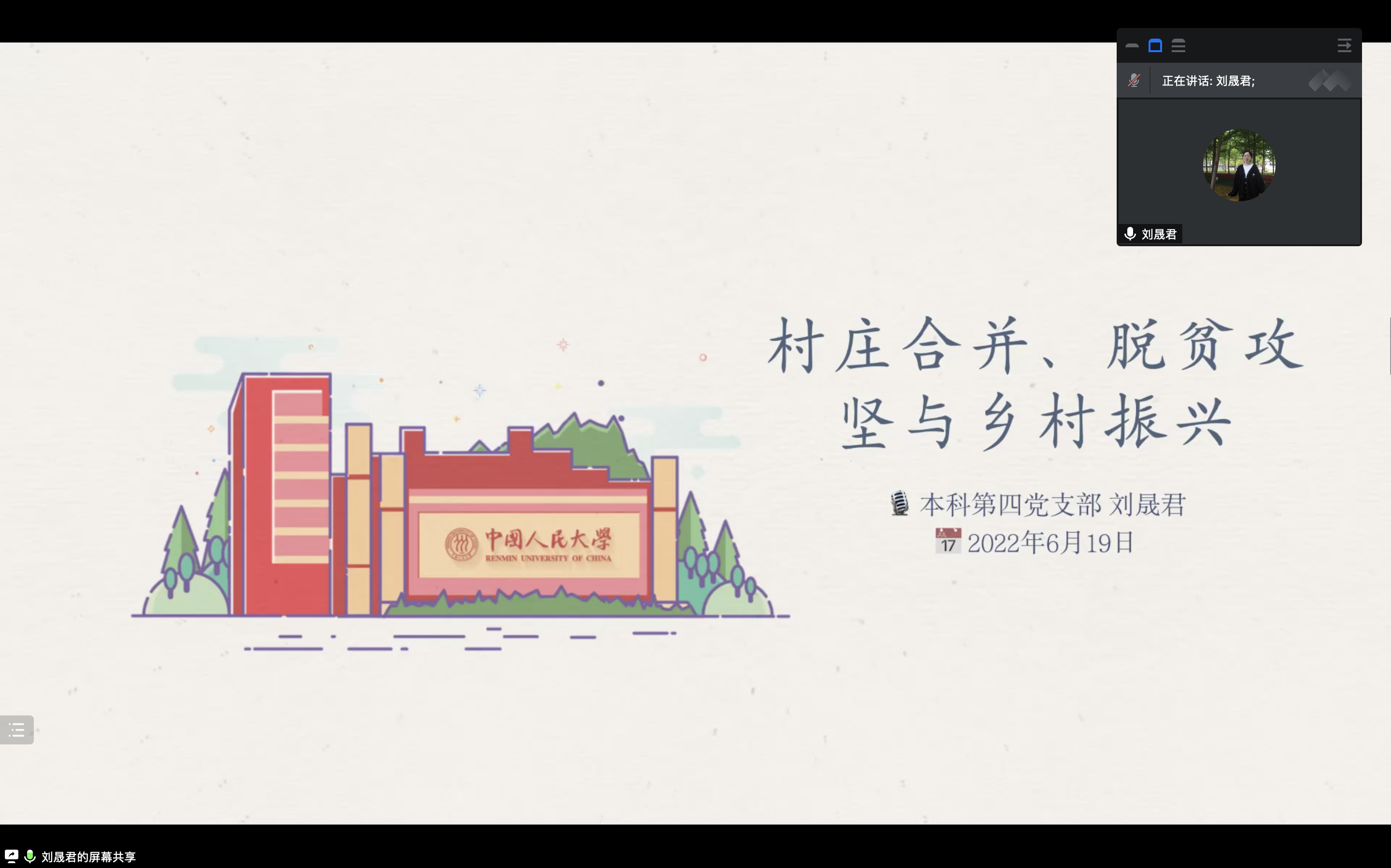 在扎根中国大地部分,王欣茹结合习近平总书记在中国人民大学考察时的重要讲话,带领与会同志回顾了中国人民大学扎根中国大地办学的优良传统,阐释了扎根中国大地办教育的重要意义。支部党员刘晟君同志以个人经历现身说法,分享自身参与“千人百村”项目的心得体会,她对村庄合并、脱贫攻坚与乡村振兴的研究展现出其主动服务国家、服务社会、服务人民的决心。