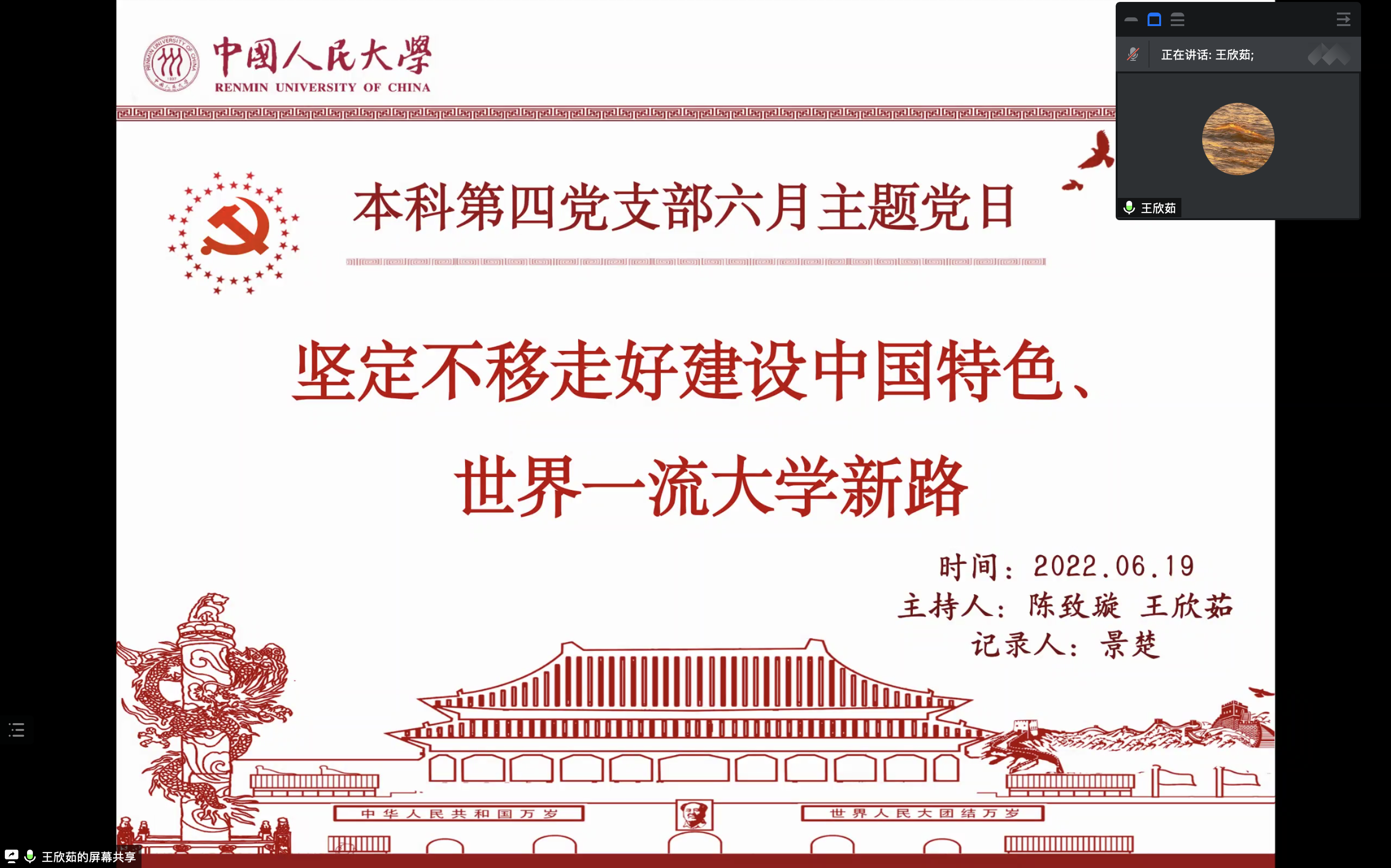 赌博网站大全导航站 本科第四党支部于2022年6月19日20:30通过腾讯会议召开六月主题党日活动。会议内容丰富,形式多样,以《坚定不移走好建设中国特色、世界一流大学新路》原文讲解为主线,从坚持党的全面领导、传承红色基因、扎根中国大地、坚定教育自信四个方面切入,将云游校史展、微党课学习、党员经历分享等环节贯穿其中。会议由支部书记陈致璇和组织委员王欣茹共同主持,支部全体党员和若干积极分子参加会议。