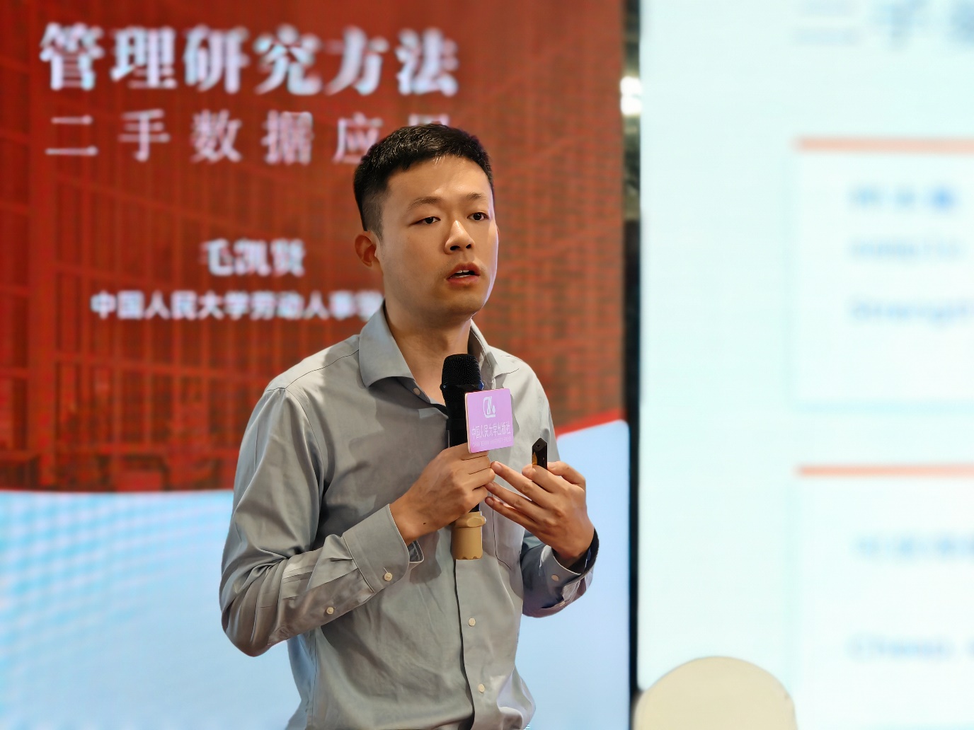 毛凯贤讲师随后就《管理研究方法:二手数据应用》进行了分享。首先,他介绍了二手数据的概念、应用范围和独特优势,针对如何应对审稿人对二手数据的质疑加以讲解。其次,他重点分享了国内外较常见的二手数据库或数据集,并结合经典范文和自身研究加以说明。最后,他向大家分享了自身应用二手数据进行研究的相关心得,特别是打造有特色的个人数据集,注意数据分析的透明和可复制性,加强视角融合促进创新,将论文写在祖国大地上。