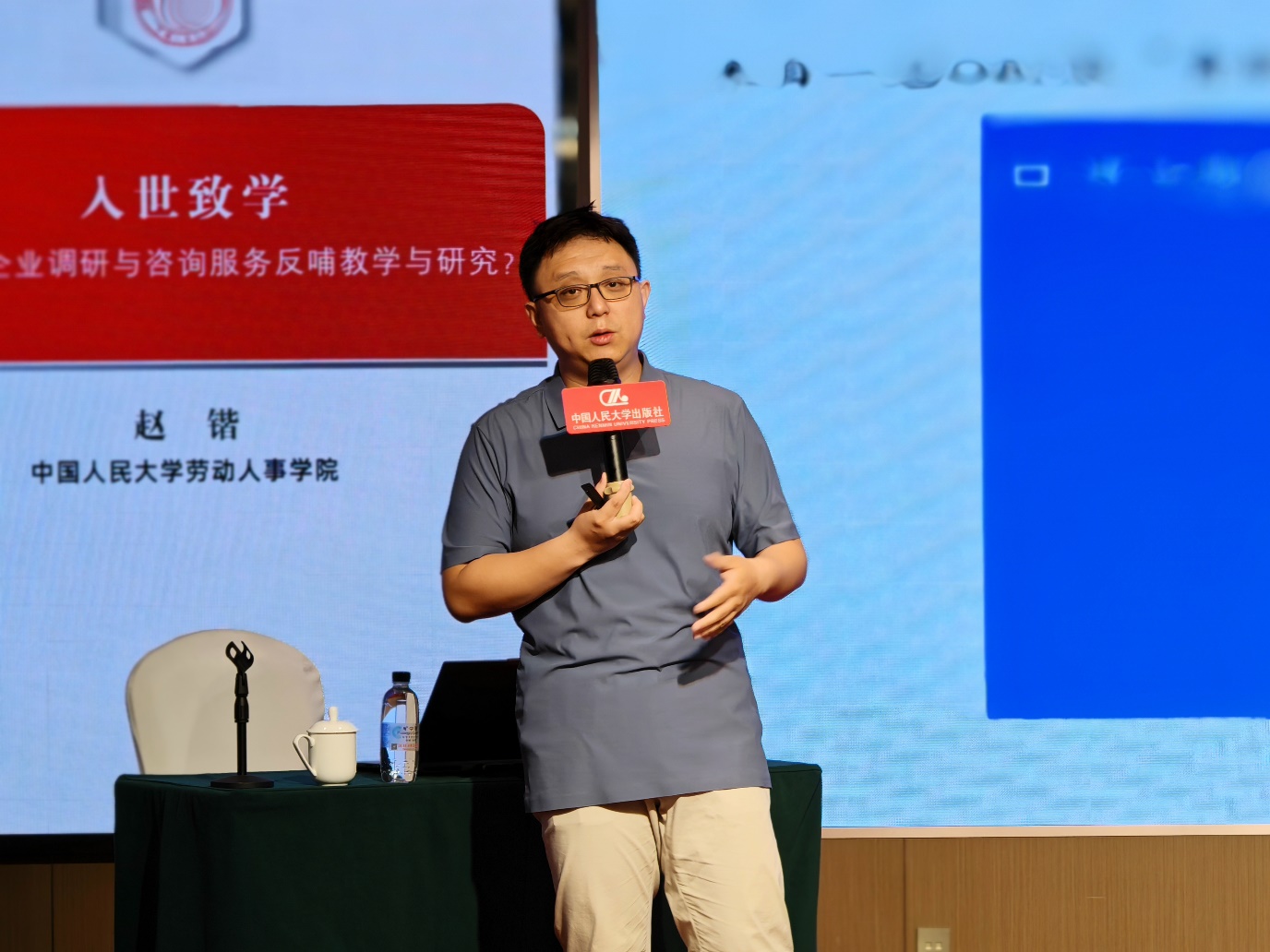 随后,赵锴副教授作了题为《入世治学:如何通过企业调研与咨询服务反哺研究与教学》的报告。在报告中,赵锴副教授着重分享了他与企业合作过程中,如何将公司面临的实际困惑与采取的应对方法转化为理论研究问题及教学案例的经验。同时,他探讨了如何让各层次的管理者积极参与到科学研究工作中,以及如何将自己的研究发现回馈企业及管理者。他强调,通过深度参与企业调研与咨询服务,不仅能让企业受益于学者的研究,还能使学术研究和教学获得实践经验的反哺。