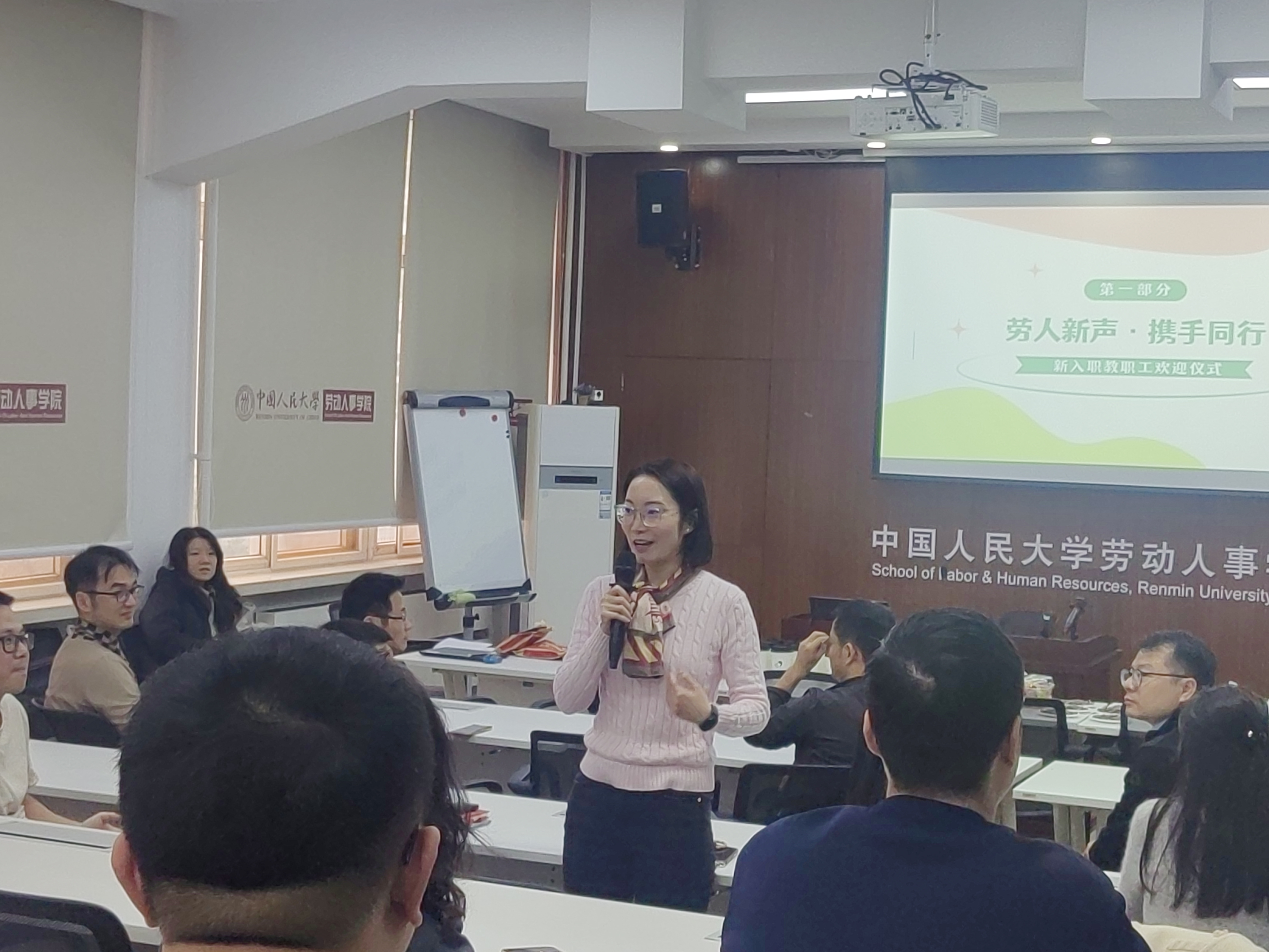 活动在“劳人新声·携手同行”新入职教职工欢迎仪式中拉开帷幕。胡涛代表学院工会向周金毅、黄础令、史健、赵彤、王倩、王峥博六位新进教职工表示热烈欢迎。随后,六位新教职工依次发言,结合自身岗位分享了入职以来的真切感受,言语真挚、情谊动人,表达了对学院文化氛围和育人环境的高度认同,更展现出投身高等教育事业、助力学院高质量发展的坚定信念与热切期盼。