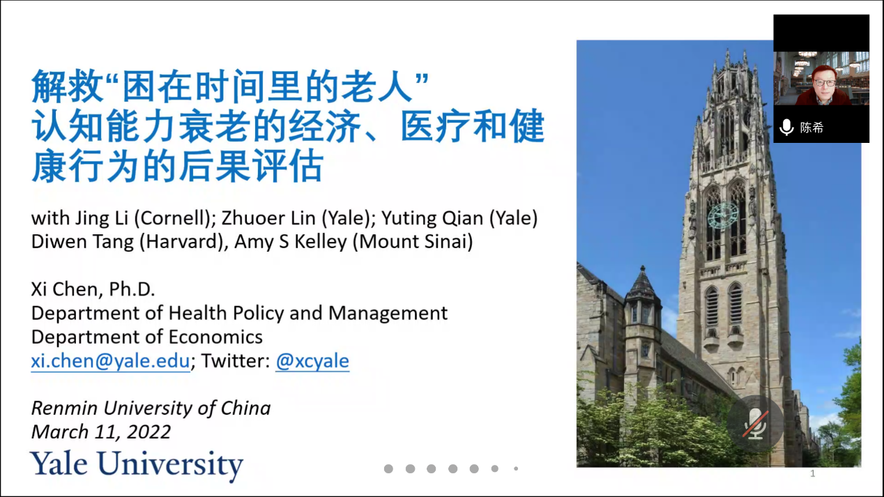赌博网站大全导航站 社会保障半月谈第57期于2022年3月11日(星期五)上午10:00至11:30,通过腾讯会议的线上会议室成功举行。来自耶鲁大学公共卫生学院的陈希副教授进行了题为“解救‘困在时间里的老人’——认知能力衰老的经济、医疗和健康行为的后果评估”的学术分享。本次学术讲座由赌博网站大全导航站 社会保障系王天宇副教授主持,郭瑜教授、刘宏教授、刘凯副教授、李乐乐助理教授等、硕博研究生和校内外专家学者共80余人参加了此次活动。