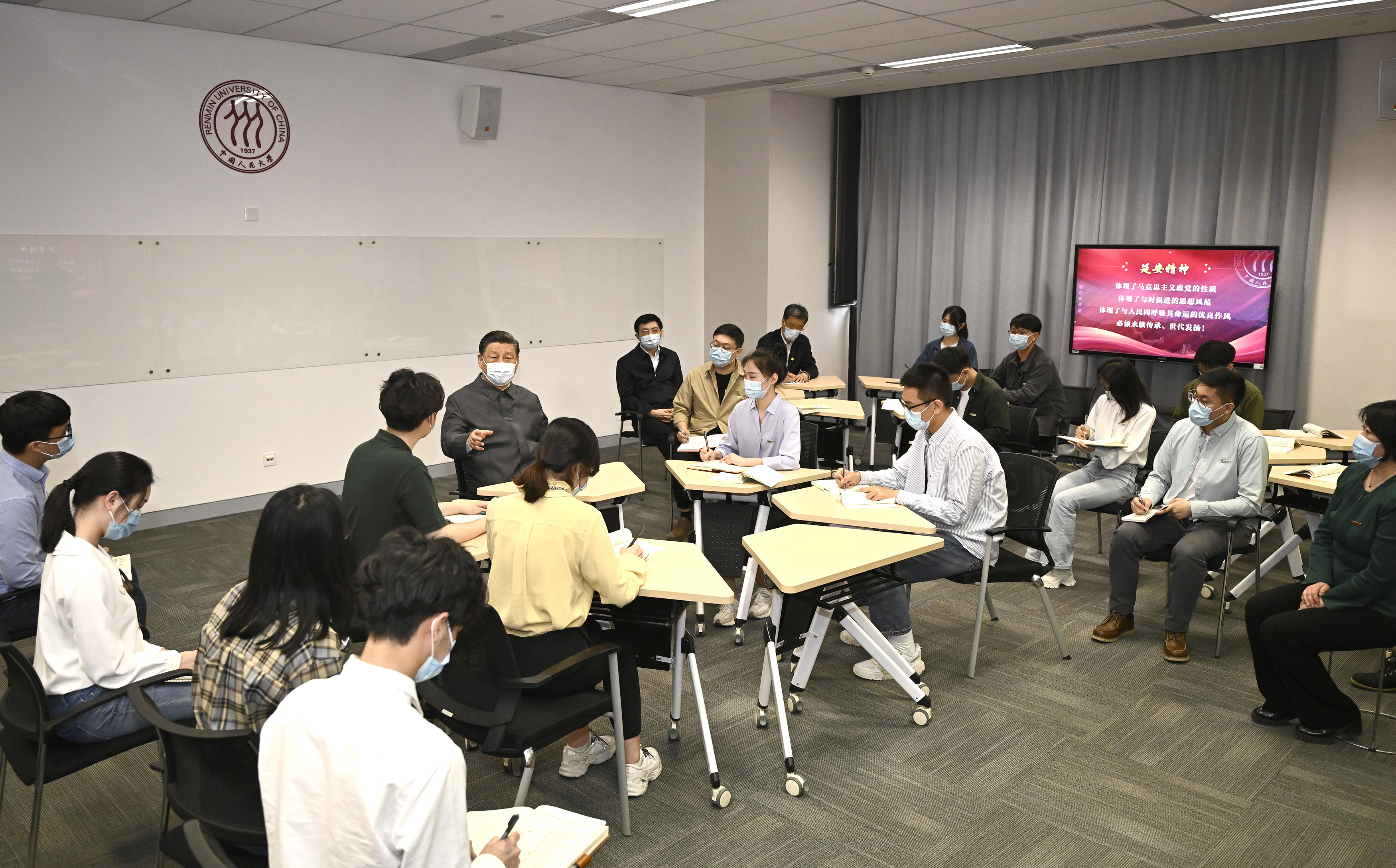 上午9时20分许,习近平在中国人民大学党委书记张东刚、校长刘伟陪同下,首先来到立德楼,观摩思政课智慧教室现场教学。习近平同青年学生一起就座,认真倾听并参与讨论,对学校立足自身优势,不断推进思政课教学改革创新,打造高精尖水平思政课的做法表示肯定。他强调,思想政治理论课能否在立德树人中发挥应有作用,关键看重视不重视、适应不适应、做得好不好。思政课的本质是讲道理,要注重方式方法,把道理讲深、讲透、讲活,老师要用心教,学生要用心悟,达到沟通心灵、启智润心、激扬斗志。青少年思想政治教育是一个接续的过程,要针对青少年成长的不同阶段,有针对性地开展思想政治教育。希望人民大学绵绵用力,久久为功,止于至善,为全国大中小学思政课教学提供更多“金课”。也鼓励各地高校积极开展与中小学思政课共建,共同推动大中小学思政课一体化建设。习近平勉励同学们坚定中国特色社会主义道路自信、理论自信、制度自信、文化自信,在全面建设社会主义现代化国家新征程中勇当开路先锋、争当事业闯将。