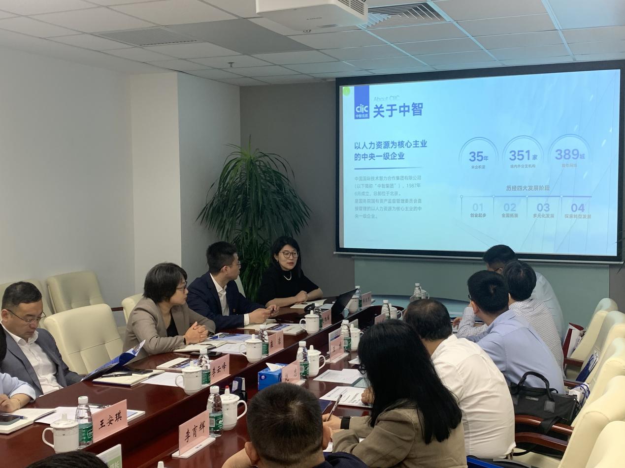 中智北京公司党委书记、总经理李云峰首先致辞,对赵忠院长一行的到来表示热烈欢迎,并详细介绍了中智北京公司的主要业务、校企合作以及中智北京未来发展战略等。随后,中智北京公司招聘与校企发展部部长韩怡然重点介绍了校企合作模式及开展情况,详细介绍了现代学徒制培养方案,希冀双方能进一步发挥各自优势,并在大学生职业指导、实习实训、课堂设置等领域开展合作。