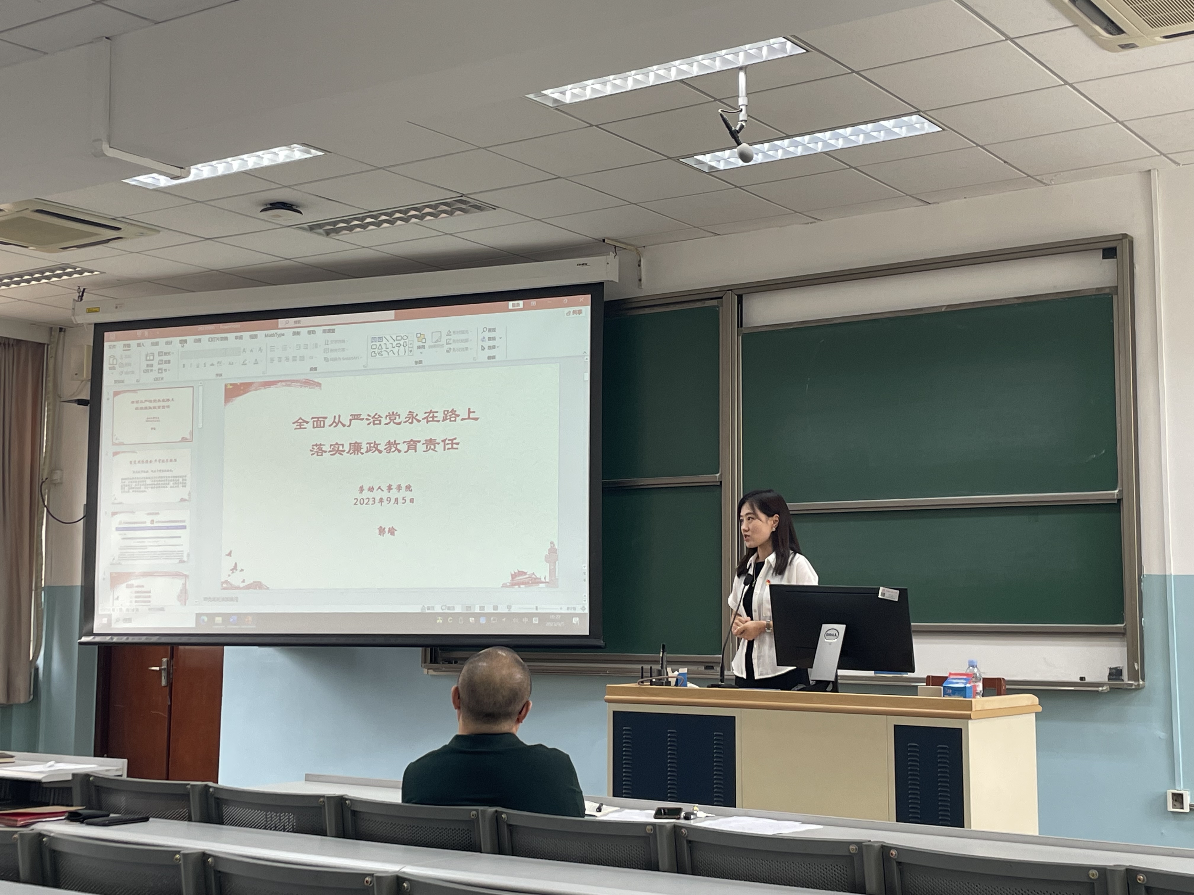 副院长、纪委书记郭瑜以“全面从严治党永远在路上”为主题进行报告。她通过若干公开警示案例来强调严守纪律规矩的重要性,学院师生应当坚定理想信念,增强政治定力、纪律定力、道德定力、抵腐定力,形成尊崇党章、遵守党纪的良好习惯。特别是每一位教职员工都应加强纪法学习,增强纪法观念,树牢底线意识,清清白白做人,干干净净做事。