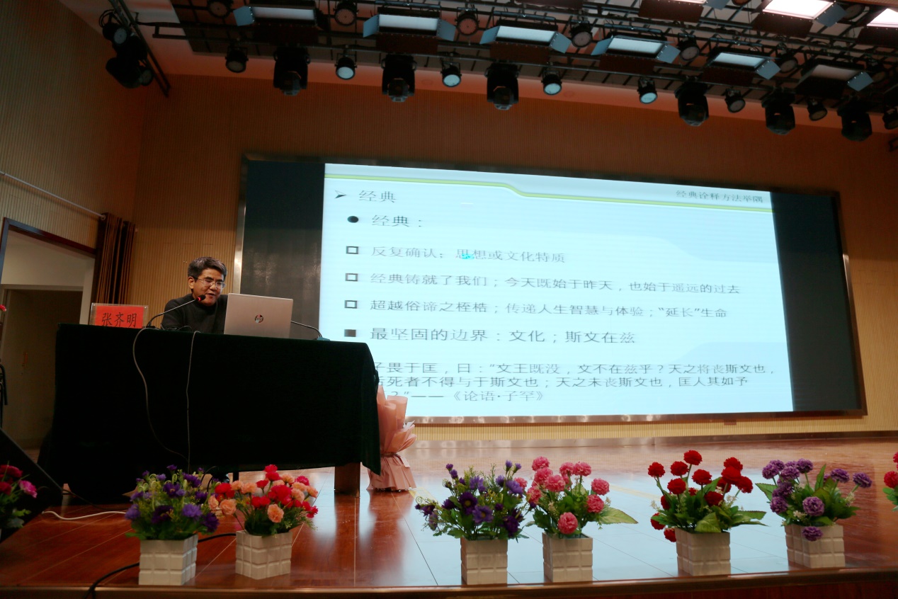 12月21日,中国人民大学国学院博士生导师张齐明副教授应邀走进宁夏自治区银川一中,为该校师生近700人做了一场中华优秀传统文化专题讲座,讲座主题为“《逍遥游》与‘魏晋风度’”,银川一中副校长蒋生福主持了此次讲座。