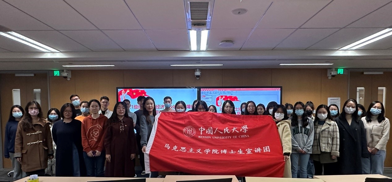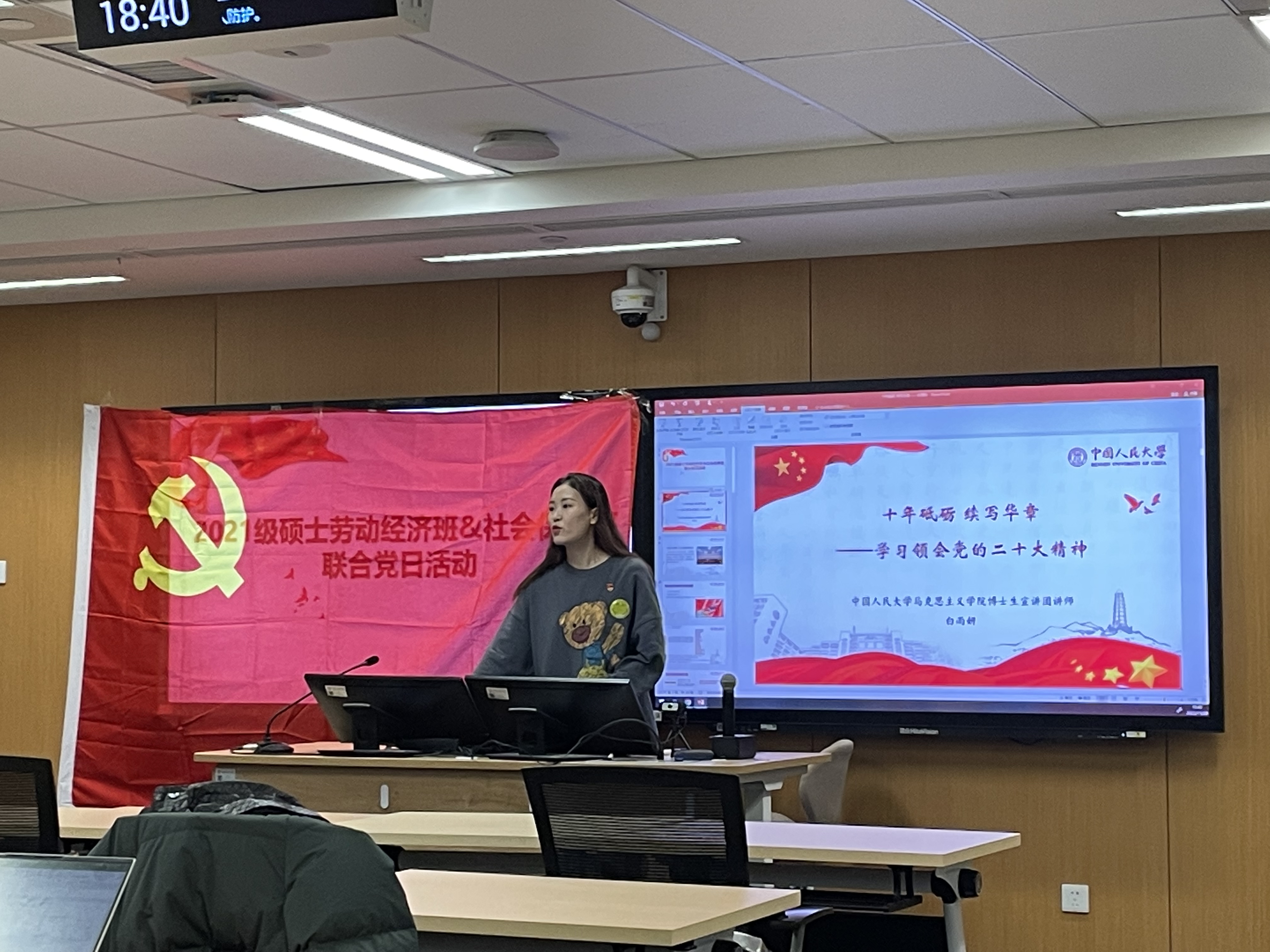 接着,中国人民大学马克思主义学院博士生宣讲团讲师白雨妍以“十年砥砺续写华章——学习领会党的二十大精神”为题,进行主题宣讲。她从经济建设、政治建设、文化建设、社会建设和生态文明建设五个方面介绍了我国过去五年的工作和新时代十年的伟大变革。她提到,正是坚持党的领导,坚持马克思主义在意识形态领域的指导,永葆团结一致、踔厉奋发、笃行不怠的精神,党和国家事业才能取得新时代的伟大成就。