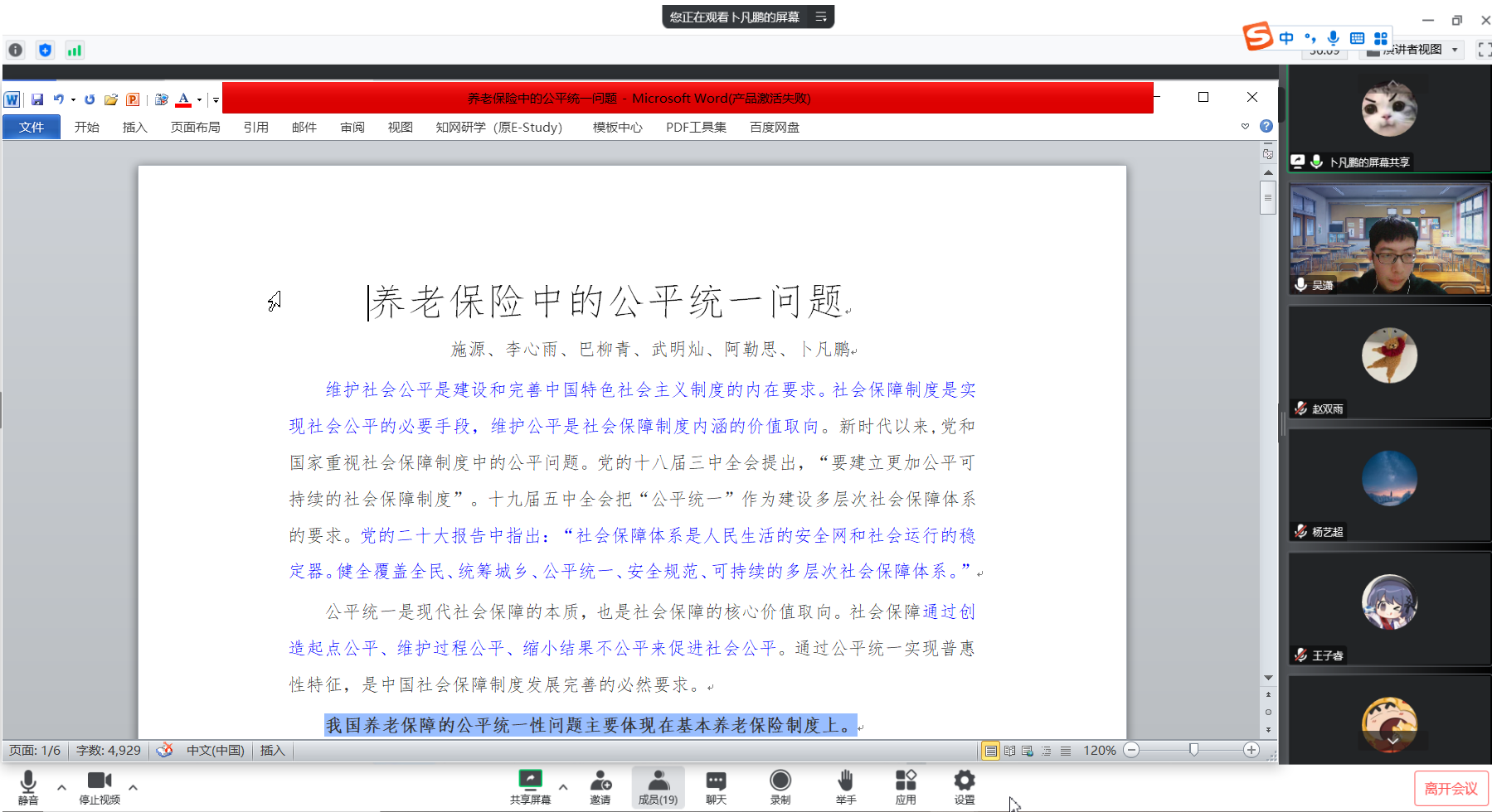 最后,乔庆梅老师在研讨总结中表示作为社会保障专业学生与科研工作者应具备“扶危济困、关切民生”的情怀,应将实现我国社会保障体系的公平统一作为自己的不懈追求,勉励与会同志在疫情环境中努力保持好身体健康,树立起学术、工作事业的远大目标,志存高远,脚踏实地,做国家的骨干和栋梁。