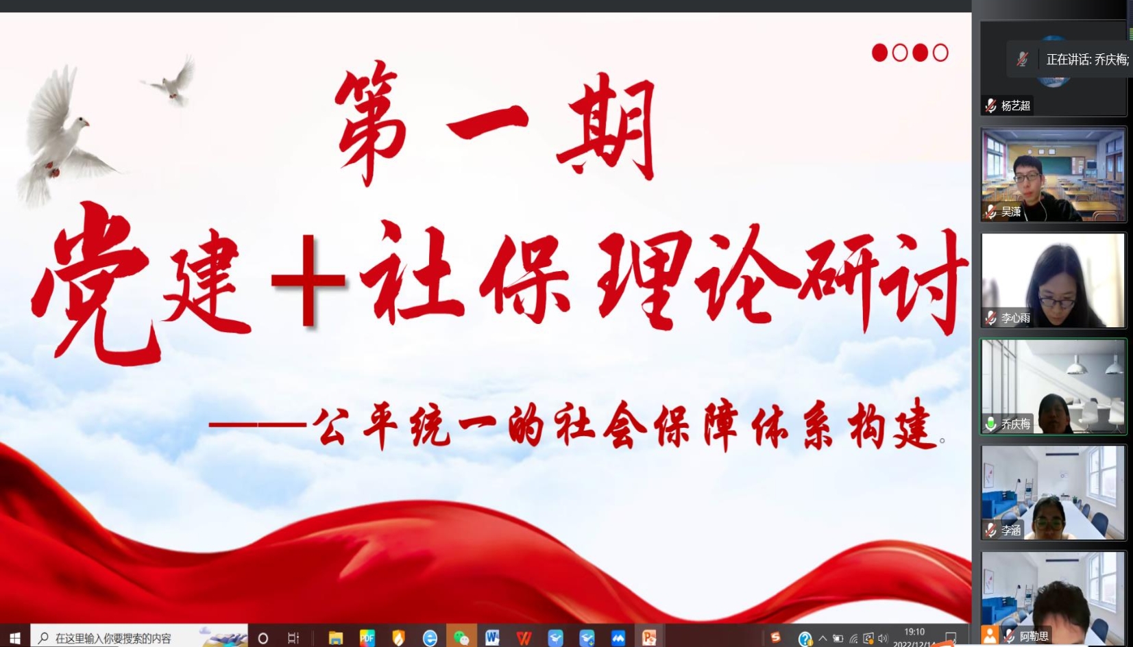 为了贯彻落实党的二十大精神及习近平总书记在考察中国人民大学时重要讲话精神,时刻做到“坚持问题导向”、“增强问题意识”“不断研究新情况,总结新经验,解决新问题”,2022级硕士社会保障班党支部于12月14日晚在线上顺利举办第一期“党建+社保理论研讨”活动。本次研讨以公平统一的社会保障体系构建为主题,分析我国社会保障公平统一问题的现状、成因及对策,旨在通过研讨党和人民关切的社会保障问题,提升支部的党性修养与专业素养,强化支部建设,筑牢坚强战斗堡垒。活动由支部书记吴潇主持,赌博网站大全导航站 副教授、2022级硕士社会保障班主任乔庆梅受邀参与研讨。