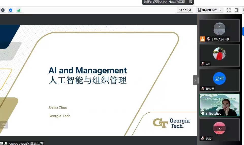 周士博的报告主题为“人工智能与组织管理”。周士博的包括首先介绍了文献中不同职业的AI暴露程度的研究结果,包括不同地区、性别、收入水平等的暴露程度的差异。随后,周士博介绍了AI对员工行为和态度的实验研究结果,包括工作中应用AI对工作效率、满意度、自我效能感、创造力的影响。最后,周士博介绍了AI对人力资源管理的影响,包括对绩效反馈、培训和招聘的影响。金秋萍老师就AI和自动化对职业发展的双重影响,AI应用的成本问题和AI对个体职业生涯发展研究中的理论问题与周士博进行了探讨。