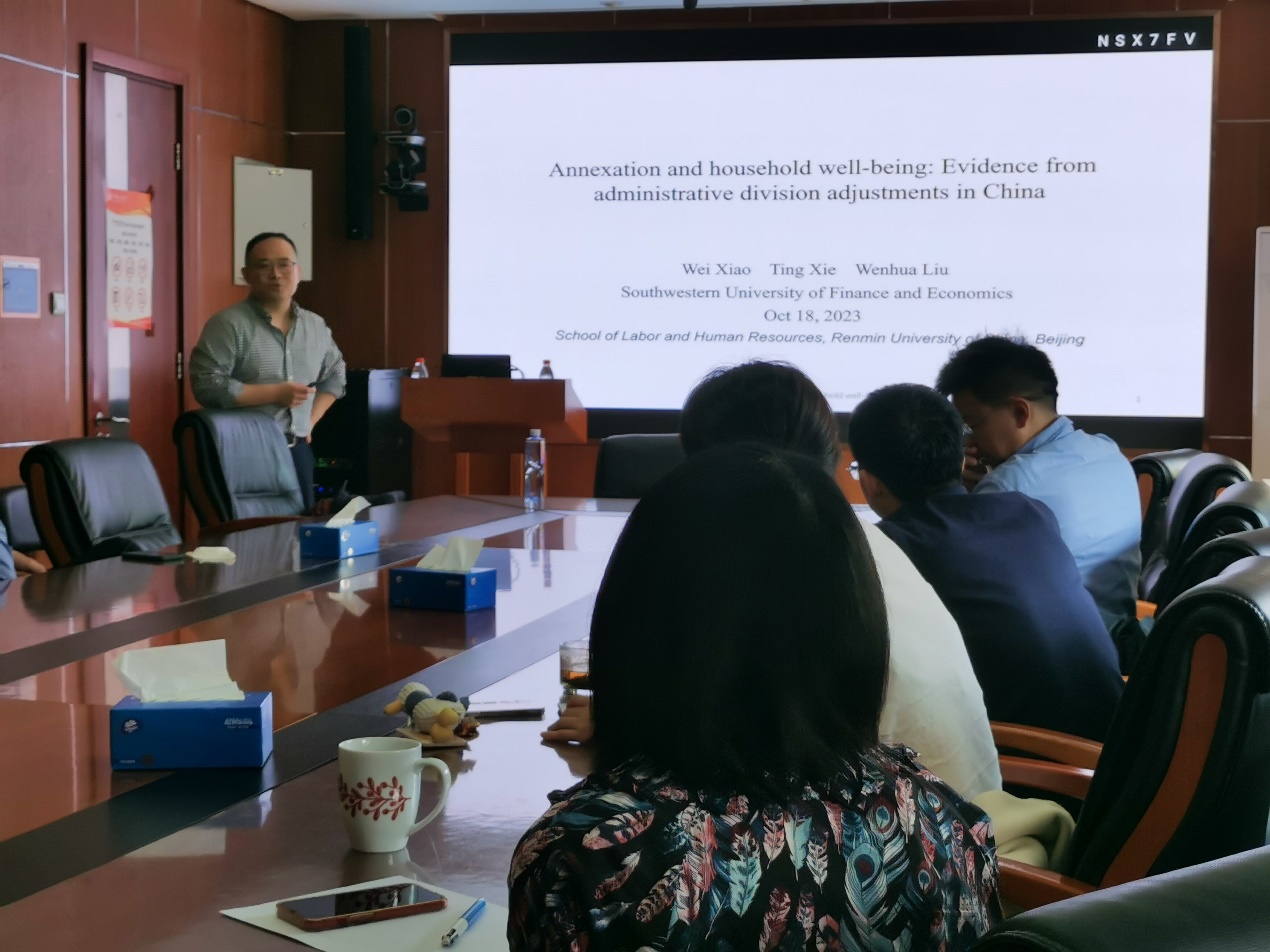 2023年10月18日下午,由赌博网站大全导航站 主办,劳动经济系和中国就业研究所承办的“劳动经济学双周论坛”第198期讲座在求是楼347会议室成功举办。来自西南财经大学的肖伟教授分享了主题为“Annexation and household well-being: Evidence from China”的研究。本次论坛由赌博网站大全导航站 赵丽秋教授主持,赌博网站大全导航站 罗楚亮教授、韩军副教授、翁茜副教授、邹先强讲师、林琳讲师、王雪凝讲师、雷子腾讲师、陈泽阳讲师、李梦婷讲师,以及其他校内外师生参与了此次讲座。