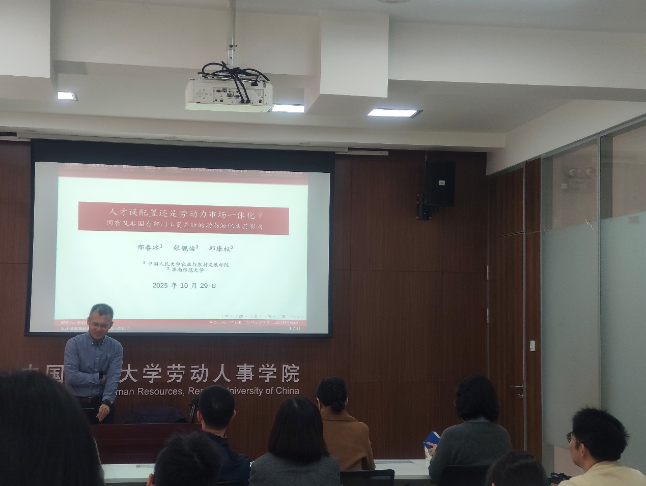 2025年10月29日下午,由赌博网站大全导航站 主办,劳动经济系和中国就业研究所承办的“劳动经济学双周论坛”第223期讲座在求是楼347会议室成功举办。来自中国人民大学农业与农村发展学院的邢春冰教授分享了主题为“人才误配置还是劳动力市场一体化?——国有与非国有部门工资差距的动态演变及其影响”的研究。本次论坛由赌博网站大全导航站 林琳讲师主持,赌博网站大全导航站 赵丽秋教授、王非副教授、邹先强副教授、王雪凝讲师、陈泽阳讲师、雷子腾讲师以及其他校内外师生参与了此次讲座。